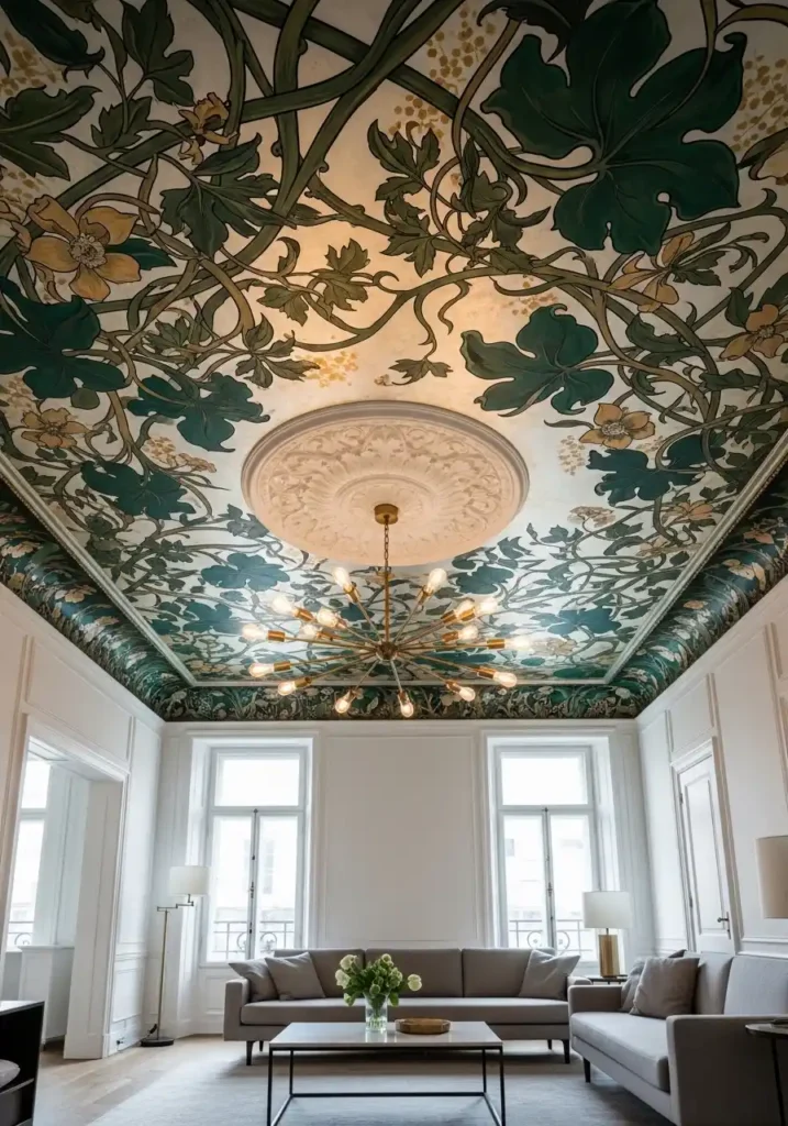 Creating a statement ceiling begins with choosing the right type of intervention for your space and your aesthetic. For the most dramatic possible impact, a hand-painted botanical or geometric mural transforms the ceiling into gallery-quality artwork that changes the entire atmosphere of the room below. Deep lacquered paint in navy, forest green, or charcoal on a ceiling creates a jewel-box effect that makes the room feel intimate and enveloping in the most glamorous way. Architectural plasterwork with elaborate cornices, central medallions, and intricate detailing adds period grandeur that no wallpaper or furniture purchase could ever approach. The rule in every case: keep the walls and floor simple so the ceiling can truly and completely own the moment it deserves.
