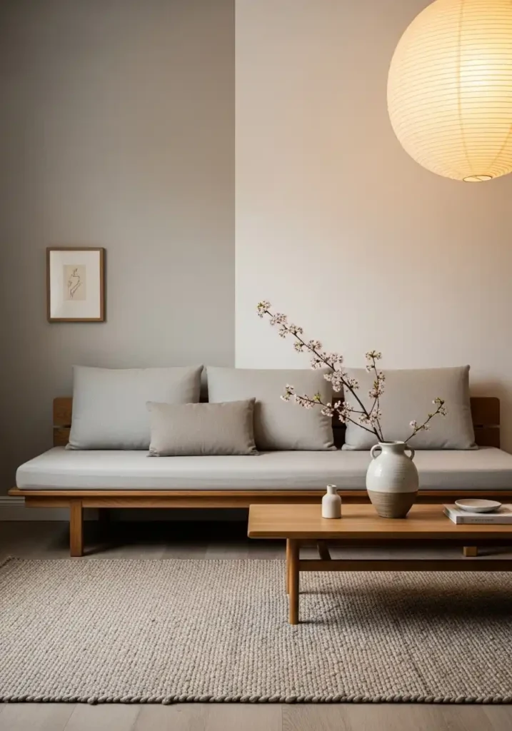 Designing a Japandi living room means choosing each element with extraordinary care and then having the discipline to stop before you add one thing too many. Low-profile furniture in warm natural woods sits close to the ground, creating a grounded, stable feeling that instantly calms the nervous system. A single handmade ceramic vase holds one perfectly chosen branch — cherry blossom in spring, bare sculptural wood in winter. A thick natural wool rug in undyed cream adds warmth and softness underfoot. Warm paper lantern lighting casts the most gentle, flattering glow. This room teaches you, every single day, that less truly is more.