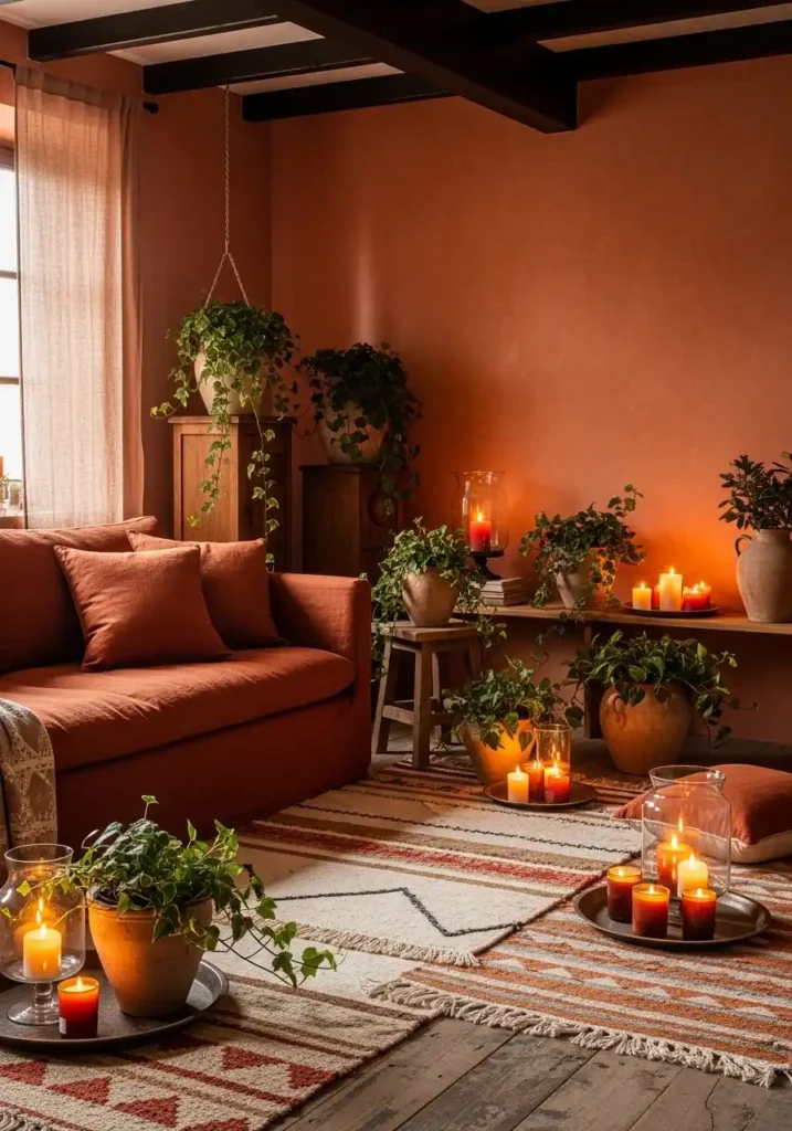 Building a terracotta living room is one of the most joyful design projects you can undertake because every single element you add seems to naturally belong. Layer your terracotta walls with a deep burnt sienna linen sofa and a collection of earthy throw pillows in rust, clay, and warm cream. Stack multiple rugs in complementary textures — a jute base rug topped with a smaller wool kilim creates incredible depth underfoot. Cluster terracotta ceramic pots in different sizes on the floor and on shelves, fill them with trailing plants, and add the warm glow of amber candlelight. This room doesn’t just look beautiful — it feels like coming home.