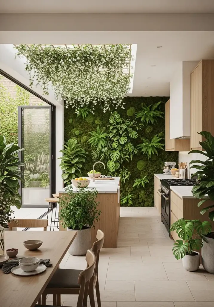 The full living green wall panel is the biophilic kitchen’s most spectacular and most completely realized expression of its design philosophy — because it transforms one entire kitchen wall from an inert, manufactured surface into a genuinely living, breathing, constantly growing and changing vertical garden of genuine organic complexity and genuine organic beauty. A properly designed living wall with a range of fern species, trailing pothos, moss panels, and climbing plants creates a kitchen wall of such rich, green, living material presence that it appears to breathe with the kitchen’s air and to change subtly with every season, every day, and every shift in natural light, making the kitchen feel genuinely, continuously alive in a way that no other design intervention can achieve.