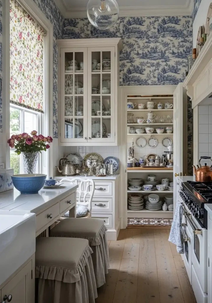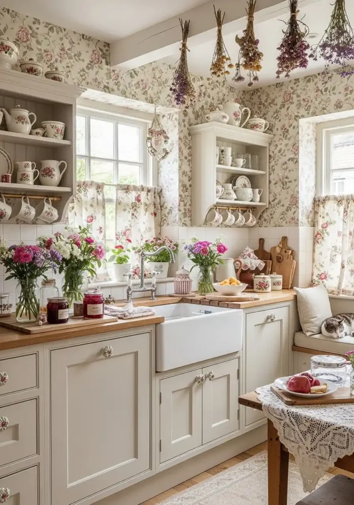 The floral wallpaper above the kitchen counter is the cottagecore kitchen’s most romantically powerful and most atmospherically complete design statement — because floral wallpaper in the kitchen transforms the cooking environment from a functional room into a garden room, surrounding the cook with the visual abundance of flowers and botanical forms that reference the garden just outside the window while creating a quality of domestic warmth and gentle, pattern-rich beauty that the most expensive hard surface material could never replicate. Soft pinks, warm creams, and sage greens in a traditional floral pattern create the specific gentle, nostalgic color world that cottagecore inhabits most beautifully — not loud or saturated but soft, slightly faded, and completely, timelessly romantic.