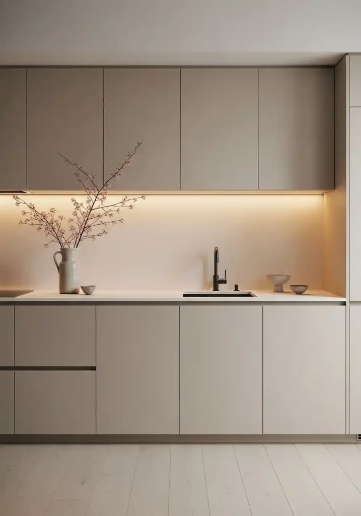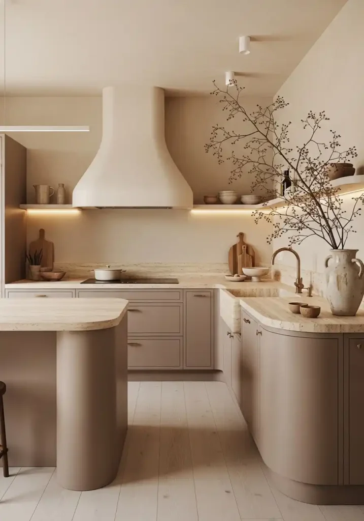 The warm putty cabinet tone of the organic modern kitchen is the specific color choice that most completely expresses the aesthetic’s essential character — because warm putty occupies the precise tonal territory between the cold, blue-toned whites of clinical minimalism and the warmer, more saturated tones of earthy or rustic design directions, creating a color of such complete, quiet, organic sophistication that it makes every natural material it accompanies appear more beautiful and more warmly resolved by its presence. Putty with travertine, with pale oak, with limewash walls, and with the warm amber of indirect LED lighting creates a kitchen of such sustained, complete, continuously beautiful warmth that it is genuinely impossible to tire of.