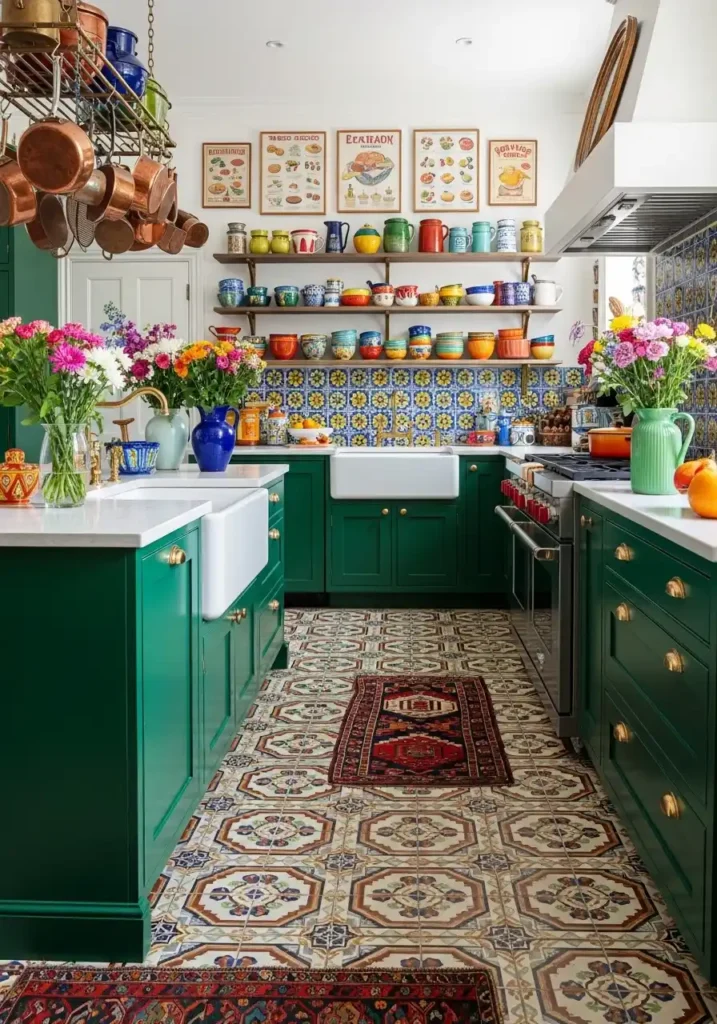 The specific quality that separates beautiful maximalism from mere clutter is the presence of genuine design intelligence in the curation and arrangement of the abundant objects — because a maximalist kitchen of real beauty is not simply a kitchen with a lot of things in it but a kitchen where every object has been chosen with genuine knowledge, genuine aesthetic judgment, and genuine personal meaning, and where the arrangement of those objects reflects a genuine compositional intelligence that creates visual richness without visual chaos. Emerald green cabinets with ornate brass hardware, encaustic tile floors, and a global pottery collection create a maximalist kitchen of such completely confident, completely personal, completely magnificent abundance that it makes every minimalist alternative appear comparatively impoverished.