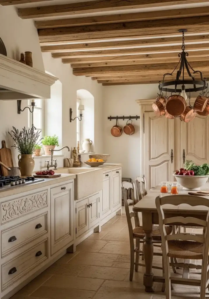 The exposed oak ceiling beams of a rustic French country kitchen are the architectural element that most powerfully and most immediately establishes the space’s historical character and its genuine connection to the agricultural building tradition of the French countryside — because the massive, hand-hewn beams of an original French farmhouse kitchen were not decorative choices but structural necessities, the actual timber frame of a building whose construction preceded the invention of the power tools that would have made their fabrication easier, and their presence in the kitchen communicates the building’s genuine age, genuine solidity, and genuine historical character with a directness and an authority that no decorative treatment applied to a modern structure can replicate.