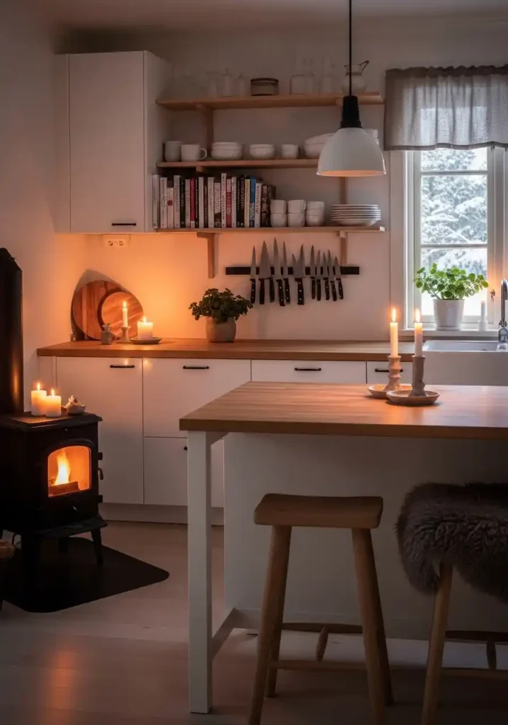 Candles are the hygge kitchen’s single most important and most atmospherically transformative design element — because candlelight creates a quality of warm, intimate, gently flickering illumination that no electric light source, however warm its color temperature, can replicate with the same organic, living quality of light movement and the same specific psychological effect of creating genuine warmth and genuine relaxation in every person who sits within its glow. A hygge kitchen illuminated by candles on the counter and the island, with a small potbelly stove casting its amber warmth from the corner, creates an atmosphere of such complete, deeply satisfying domestic comfort that every evening meal prepared within it feels like a genuinely precious, genuinely cherished moment.