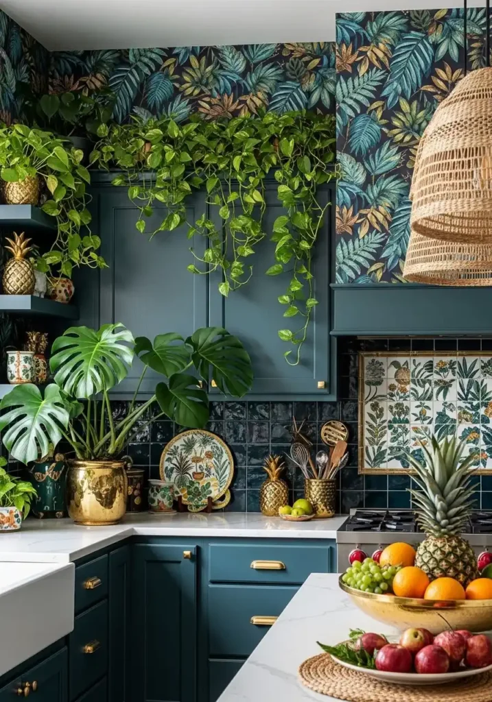 The dramatic tropical leaf wallpaper above the kitchen counter is the tropical maximalist kitchen’s most atmospherically powerful and most completely immersive design element — because large-scale tropical botanical wallpaper in deep, saturated greens and blues creates an immediate, total visual environment of such rich, abundant, genuinely tropical botanical beauty that it transforms the kitchen from a room with nice decoration into a genuinely immersive space where the cook is surrounded on all sides by the visual richness of monstera leaves, palm fronds, and bird of paradise flowers rendered at a scale and a color intensity that makes the kitchen feel like stepping into the most beautiful tropical botanical garden rather than simply a room with a floral pattern on the wall.