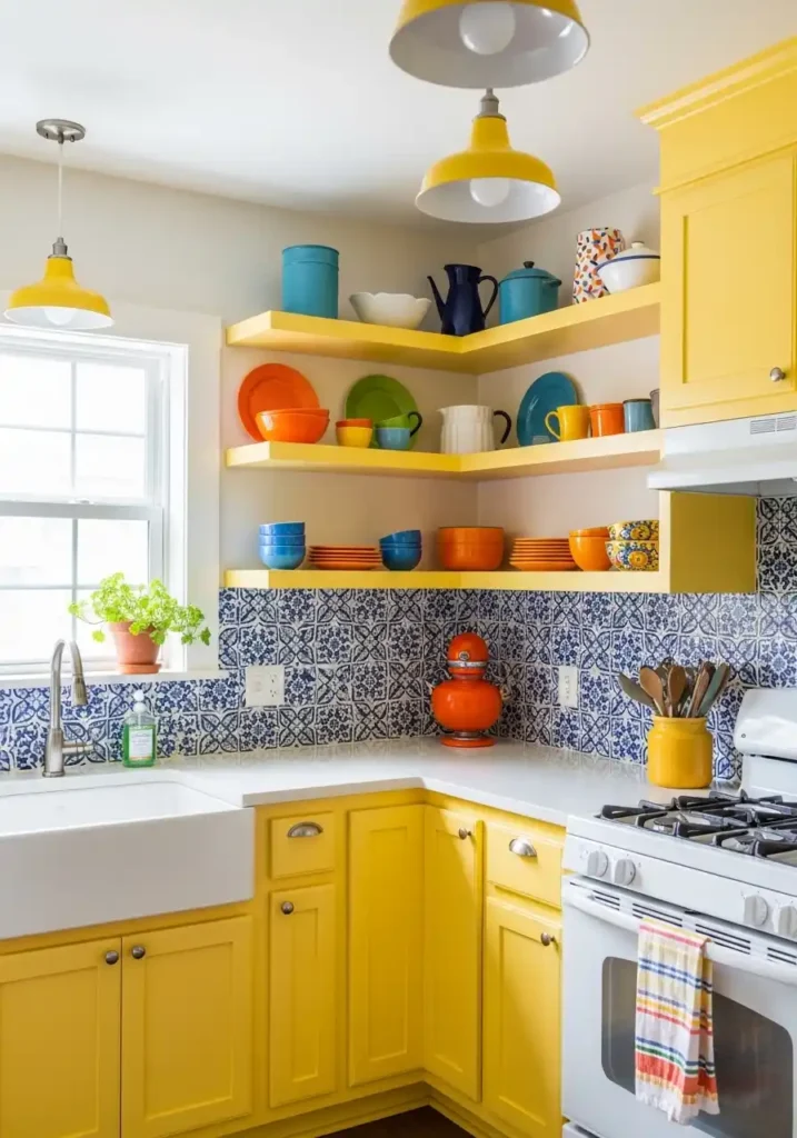 Sunshine yellow is perhaps the most joyfully transformative and the most consistently mood-lifting color choice for a small kitchen — because yellow is the color of sunlight, of warmth, of morning optimism, and of the specific energy that cooking and eating and sharing food together most naturally inhabit. A small kitchen in sunshine yellow cabinets with a blue and white Mediterranean tile backsplash, colorful ceramic dishes on open shelves, and cheerful vintage-style pendant lights creates a room of such concentrated, unapologetic happiness that every person who enters it feels immediately, physically better than they did before. This is the kitchen that makes cooking dinner a genuinely pleasurable experience rather than an obligation to be fulfilled in a room that inspires nothing.