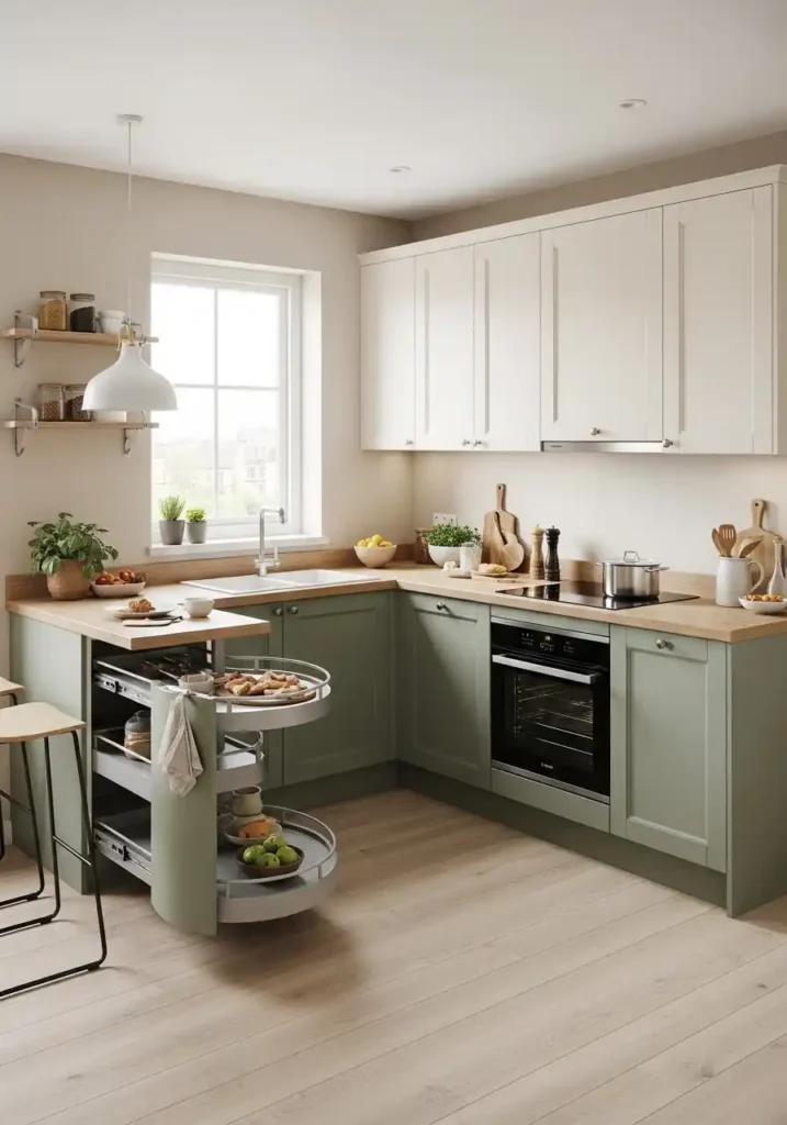 A compact L-shaped corner kitchen is the layout that makes the most complete and the most practically intelligent use of the specific spatial geometry of a corner — creating two full runs of counter and cabinet space that meet at a right angle, providing the kitchen with working surfaces on two walls simultaneously and delivering a total of usable counter length and cabinet volume that far exceeds what a single straight run of the same total cabinet count could provide. The corner junction, which is the layout’s most challenging spatial point, becomes the kitchen’s most storage-rich location when fitted with a properly engineered corner cabinet solution — a full carousel, a magic corner pull-out, or a diagonal drawer unit — that makes every inch of the corner’s depth genuinely accessible.