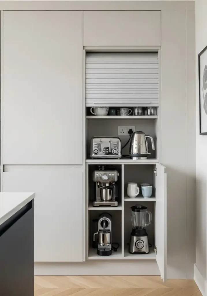 An appliance garage — a dedicated section of counter-height cabinetry with a roll-up tambour door or a hinged lift-up door that completely conceals the kitchen’s small countertop appliances when not in use — is the small kitchen’s most effective and most consistently satisfying solution to the problem that most compromises the compact kitchen’s visual appeal and perceived spaciousness: the accumulation of toasters, coffee machines, kettles, blenders, and other small appliances on the counter that consumes precious workspace and creates the visual clutter that makes small kitchens feel messy, cramped, and perpetually inadequate. The appliance garage hides everything and returns the counter to the clear, useful, beautiful working surface it was always meant to be.