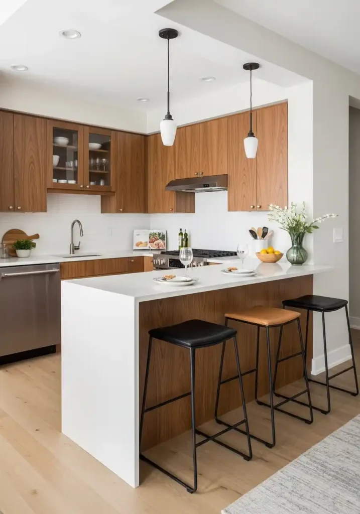 The overhang dimension on the living side of the peninsula — the distance by which the countertop extends beyond the base cabinets to create a knee space for stools — is the critical measurement that determines the peninsula’s success as a dining and social surface. An overhang of 30 to 35 centimeters provides adequate knee space for comfortable seated dining at counter-height stools, while an overhang of less than 25 centimeters creates an uncomfortable, knee-banging dining experience that makes the peninsula feel like a design compromise rather than a genuine dining provision. Match the peninsula’s countertop material to the main kitchen counter for a seamless, unified appearance, or use a contrasting material — warm walnut against white quartz — for a peninsula that reads as a deliberately distinct piece within the kitchen composition.