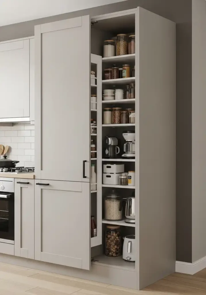 A hidden pantry in a small kitchen — a full pantry cupboard concealed behind a cabinet panel finished in the same material, the same color, and the same hardware pattern as the surrounding kitchen cabinetry, making it completely invisible when closed — is the storage solution that most dramatically changes the experience of cooking and living in a compact kitchen by providing a volume of organized storage for dry goods, canned foods, and small appliances that the kitchen’s visible cabinet runs could never accommodate, while maintaining the visual calm and the uncluttered aesthetic of a kitchen that appears to have perfectly adequate but not excessive storage. The hidden pantry is the small kitchen’s best-kept secret.