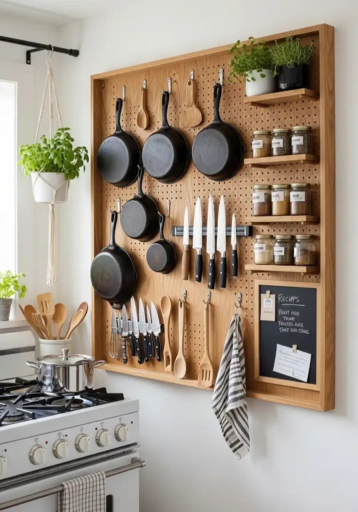 A pegboard in natural oak rather than in the utilitarian painted wood or white MDF that most people associate with pegboards transforms this functional tool into a genuine design feature that adds warmth, material beauty, and a genuinely crafted quality to the kitchen wall. Natural oak pegboard looks like a piece of beautiful, considered kitchen furniture rather than an organizational system installed out of necessity, and when styled with genuine care — cast iron pans grouped by size, wooden utensils arranged by height, fresh herbs hanging from a small planter, spice jars lined up on a tiny shelf — the kitchen pegboard becomes simultaneously the room’s most practical wall and its most visually characterful, most personally expressive surface.