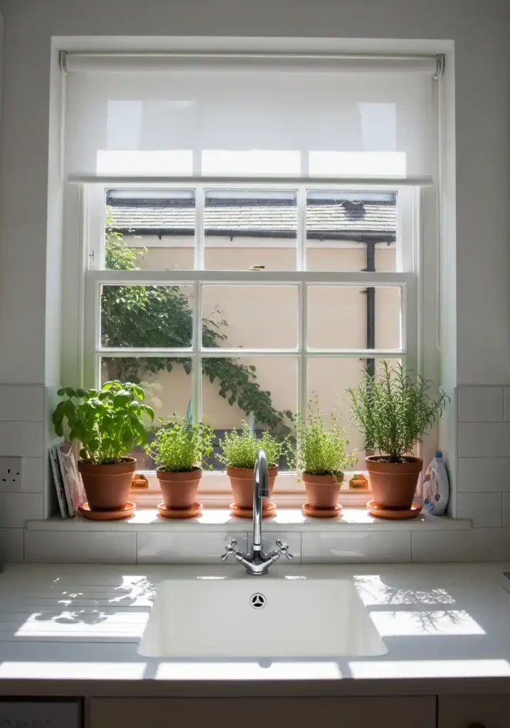 The windowsill above the kitchen sink is the small kitchen’s most perfectly located and most beautifully lit growing surface for fresh herbs — because it provides the direct natural light that herbs require for vigorous growth, the proximity to water that makes watering effortless, and the accessibility from the cooking surface that makes picking fresh herbs a natural and pleasurable part of every cooking session rather than a separate trip to a garden or a reaching expedition to a shelf. Terracotta pots with basil, thyme, rosemary, and chives on the kitchen windowsill are simultaneously the kitchen’s most practical plant collection, its most beautiful organic decoration, and its most aromatic and sensory-enriching daily companion. They transform washing up into gardening.