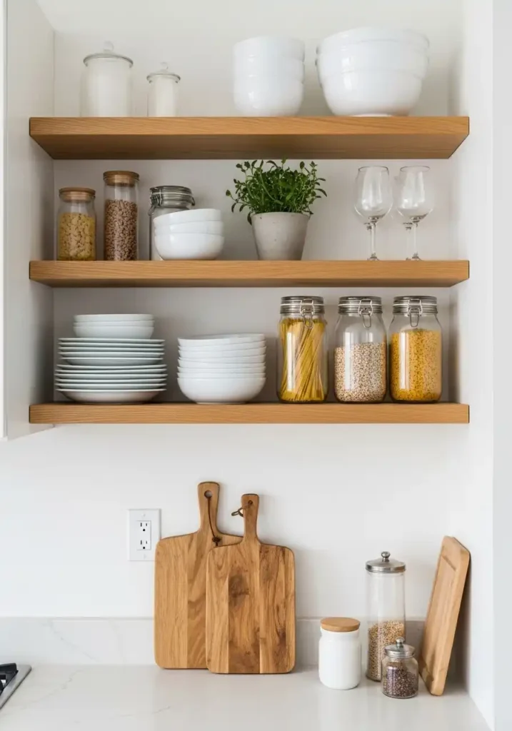 The practical reality of open kitchen shelving — that everything stored on them is always visible and must therefore always be beautiful, organized, and intentionally chosen — is not a disadvantage but a discipline that consistently produces kitchens of superior aesthetic quality to those with closed upper storage. When every plate, every glass, every jar, and every kitchen essential must earn its visible place on an open shelf, the kitchen naturally accumulates only objects of genuine beauty and genuine daily use, eliminating the clutter of rarely-used items that closed cabinets tend to accumulate over years of convenience. Choose beautiful ceramics, clear glass storage jars, and wooden accessories for your open shelves and the resulting display will be both genuinely functional and genuinely beautiful.