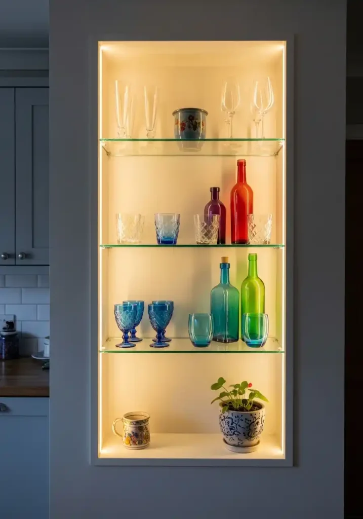 The interior lighting of a recessed kitchen niche transforms it from a purely practical storage recess into a glowing architectural feature of genuine beauty that adds warmth, depth, and a quality of considered elegance to the small kitchen’s wall surface. Warm LED strips installed along the niche’s top edge or side edges create a pool of warm amber light within the recess that makes every object displayed within it — a collection of beautiful glassware, a row of colored glass bottles, a ceramic plant pot — glow with an intensity and a warmth that the same objects on an ordinarily lit shelf could never match. The glowing niche becomes one of the small kitchen’s most visually beautiful and most atmospherically generous design elements, visible from the adjacent living area as a warm, inviting window of warm light within the kitchen wall.