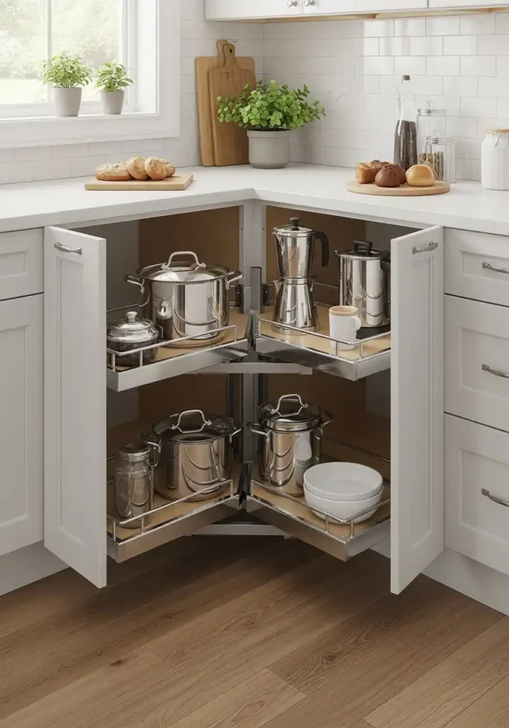Kitchen corners are the most consistently wasted and the most consistently frustrating storage locations in any kitchen layout — because the diagonal depth of a corner cabinet interior creates a storage space that is simultaneously enormous in volume and completely inaccessible in practice when fitted with conventional fixed shelving, leaving a vast dead zone of unusable space behind the point where the human arm can comfortably reach. The various engineered corner storage solutions developed specifically to solve this problem — the magic corner, the full carousel, the diagonal drawer system, and the Le Mans pull-out — transform the kitchen’s most frustrating storage failure into one of its most generous and most satisfying storage successes.
