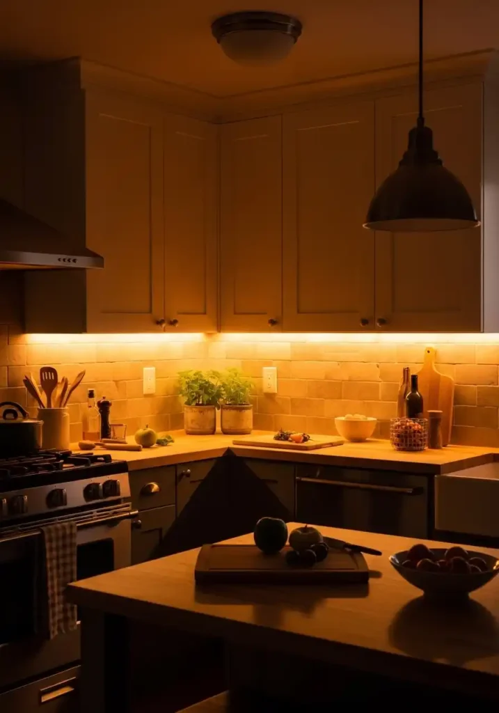 The specific color temperature of the LED strips chosen for under-cabinet kitchen lighting is the technical decision with the greatest atmospheric consequence — and warm white LEDs at 2700 to 3000 Kelvin create the most beautiful, most flattering, and most genuinely atmospheric kitchen lighting effect, casting a warm amber glow across the counter and backsplash that makes food look more beautiful, makes the kitchen feel more welcoming, and creates the specific quality of warm, intimate light that makes cooking in the evening feel like a genuine pleasure rather than a functional necessity. Avoid cool white or daylight LEDs, which create a harsh, clinical light that makes the kitchen feel like a hospital operating theater rather than the warm, beautiful heart of the home it deserves to be.