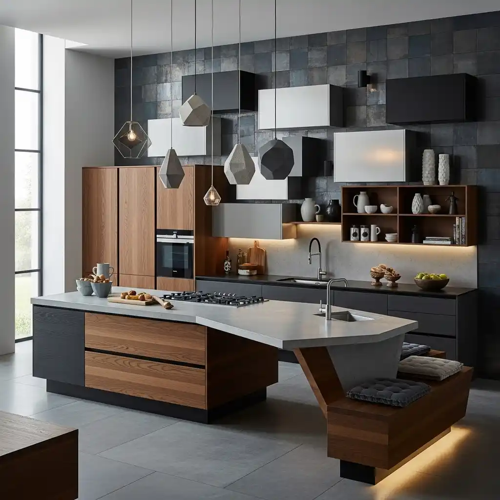 An asymmetrical kitchen layout breaks traditional rules to create unique flow. By varying cabinet heights and placements, movement feels more dynamic and less predictable.