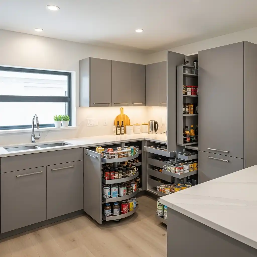 A corner-focused kitchen layout optimizes often-overlooked areas, improving overall flow. Smart corner solutions prevent dead space and make movement smoother throughout the kitchen.