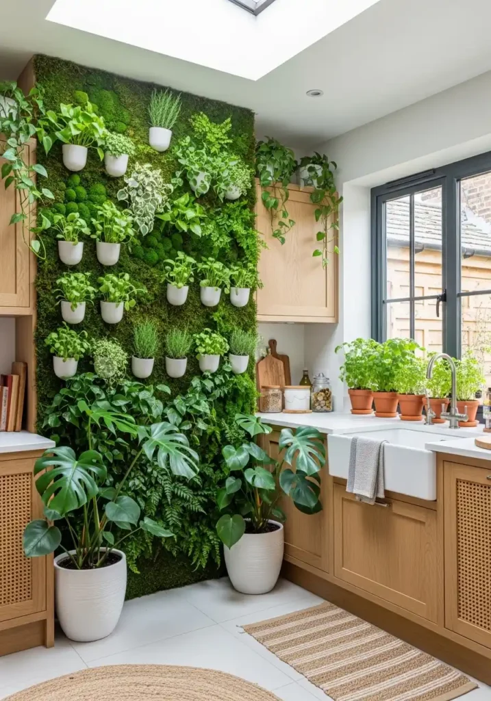 The full living green wall panel is the biophilic kitchen trend’s most spectacular and most completely transformative single design element — because a properly designed and properly maintained living wall introduces a scale of organic beauty, genuine living presence, and continuous natural change into the kitchen environment that no potted plant, no botanical print, and no plant-inspired color palette can approach with the same completeness and the same biological authenticity. The living wall breathes, grows, changes, releases oxygen, and creates a gentle botanical fragrance that fills the kitchen with the most completely natural and the most completely restorative sensory environment available in any domestic room.