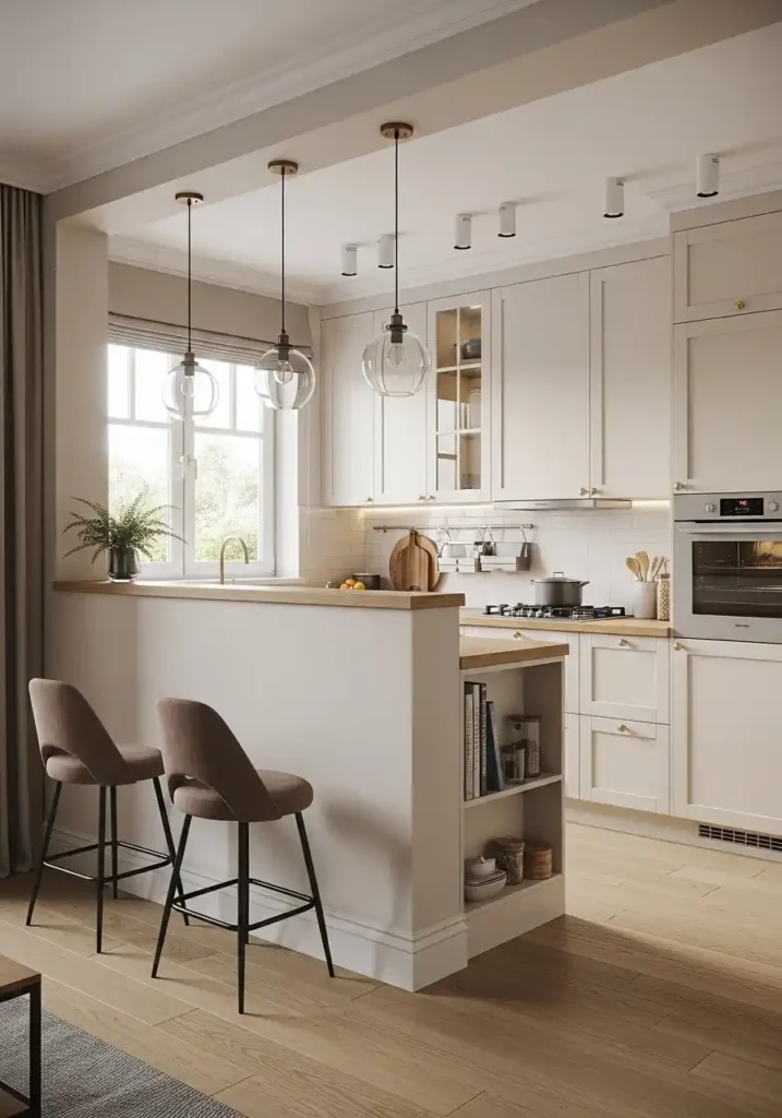 The partial height dividing wall is the broken plan kitchen’s most elegant and most architecturally resolved spatial device — because a wall that rises to approximately two meters, leaving a significant gap of open space between its top edge and the ceiling above, creates a spatial separation of sufficient visual and acoustic clarity to give the kitchen its own distinct zone identity while the open space above the wall maintains the visual connection, the light sharing, and the sense of spatial continuity that makes the combined living environment feel genuinely, generously connected rather than fragmented. Open shelving integrated into the kitchen-facing side of the partial wall converts what would otherwise be a blank dividing surface into a beautifully useful and beautifully designed storage and display feature.