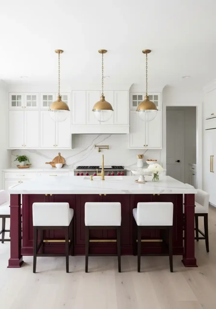Deep burgundy is the dark island color leading this trend — because burgundy, with its specific combination of deep red warmth and slight purple complexity, creates a color of such concentrated, jewel-like beauty that it appears to absorb and radiate warm light simultaneously in a way that is completely unique among the dark island color options available. Against a white kitchen, the burgundy island appears even more vividly, more deeply, and more completely beautiful than it would in any other context — the white amplifying the burgundy’s richness by the maximum possible contrast and the burgundy making the surrounding white appear more luminously, more brilliantly pure by its magnificent dark presence.