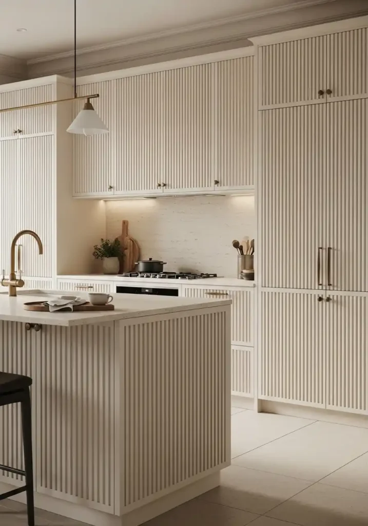 The specific beauty of fluted cabinet fronts in warm cream lacquer is the way the reeded grooves catch warm kitchen light — natural daylight in the morning, pendant warmth in the evening — and reflect it back from the curved peaks of each reed in a series of parallel highlights that make the cream surface glow with a depth and a luminosity that a flat cream panel can never achieve. The fluted trend’s remarkable staying power in contemporary kitchen design comes from this specific quality of light interaction — a surface that looks genuinely different and genuinely beautiful at every hour of the day, creating a kitchen that rewards sustained, daily attention with continuously renewed visual pleasure.