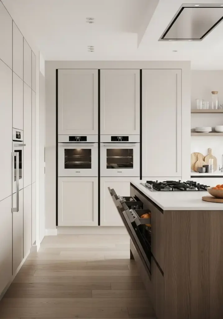 The ceiling-integrated range hood is the integration trend’s most technically ambitious and most architecturally dramatic achievement — because the conventional range hood, however beautifully specified, is always a visually prominent element that requires the eye to accommodate its presence within the kitchen’s architectural composition. A hood integrated completely into the ceiling plane, leaving only a barely visible perforated intake strip at ceiling level, eliminates the range hood from the kitchen’s visual field entirely — allowing the ceiling to remain perfectly flat and perfectly continuous from wall to wall in a gesture of such complete architectural resolve that the kitchen feels like a space where design has overcome every practical obstacle with total, magnificent confidence.