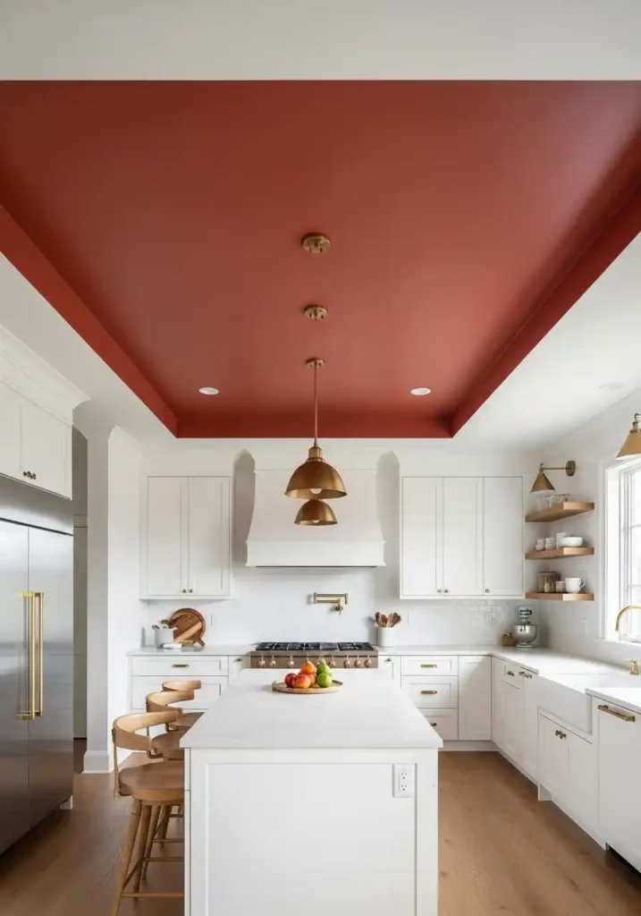 The specific painted ceiling color that creates the most beautiful and the most completely atmospheric kitchen elevation depends entirely on the kitchen’s existing palette — but warm terracotta above a white kitchen creates the most completely resolved and the most warmly beautiful of all painted ceiling options currently leading this trend, because terracotta’s warm, slightly red-orange tone creates a ceiling of such completely different character from the white walls and white cabinets below it that the kitchen feels like a genuinely, architecturally distinct space rather than a white room with a colored ceiling. The terracotta canopy makes every element of the white kitchen appear more luminous, more precisely finished, and more completely beautiful in the warm, amber-toned overhead light it creates.