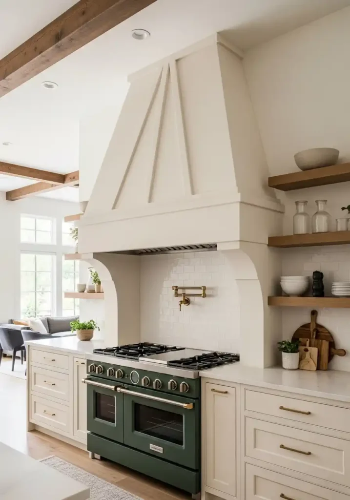 The sculptural plaster range hood in a bold geometric form is the current trend’s most spectacular and most architecturally accomplished expression — because a hood formed in smooth, seamlessly finished plaster in a custom-designed pyramidal, domed, or dramatically arched profile becomes fully part of the kitchen’s architectural envelope rather than a separate appliance element attached to it, creating a wall composition of such sculptural confidence and such complete architectural resolution that the entire kitchen focal wall reads as a single, intentional, magnificently designed architectural statement. From the living area sofa across the open plan, the plaster hood creates a focal point of such genuine beauty and authority that it anchors the entire combined space with the certainty of a great chimney breast.
