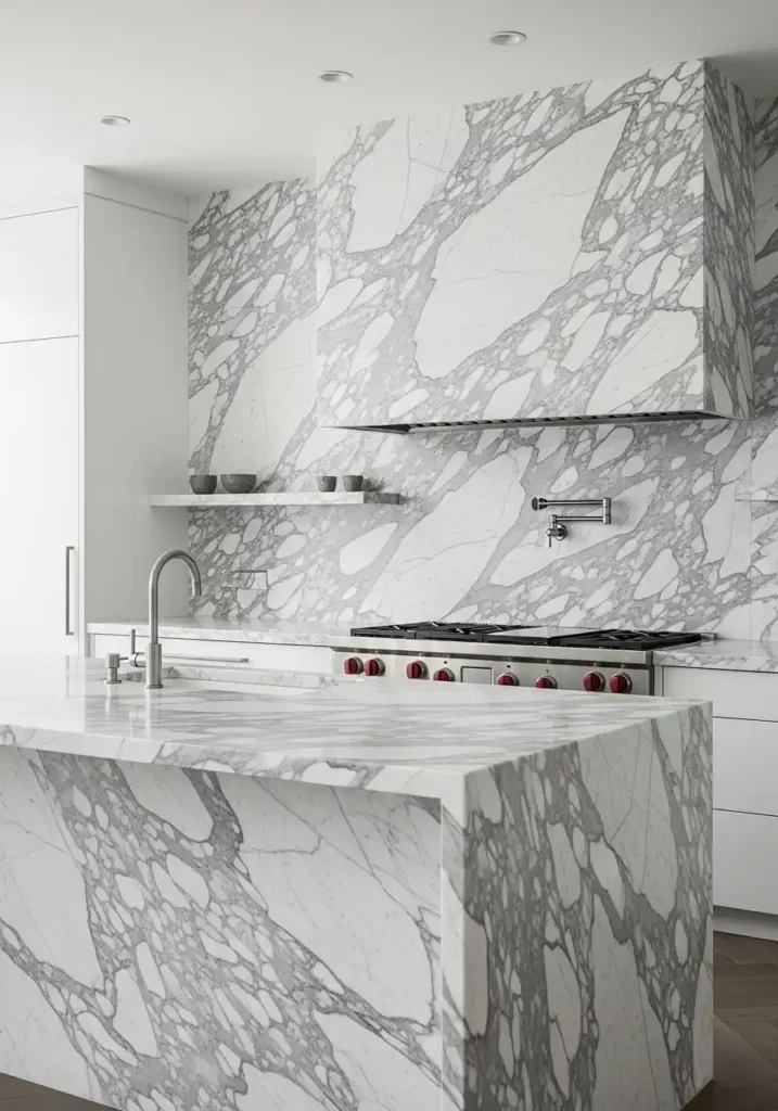 The stone slab everything trend pushes the natural stone kitchen concept to its logical, magnificent extreme — applying the same stone material to every possible kitchen surface simultaneously, from countertop to backsplash to range hood cladding to island sides, creating a kitchen environment of such complete, continuous geological beauty that the stone appears not as a surface applied to the kitchen’s architecture but as the kitchen’s architecture itself. The stone slab kitchen is the most materially ambitious and the most luxuriously resolved kitchen design available in contemporary residential interiors.
