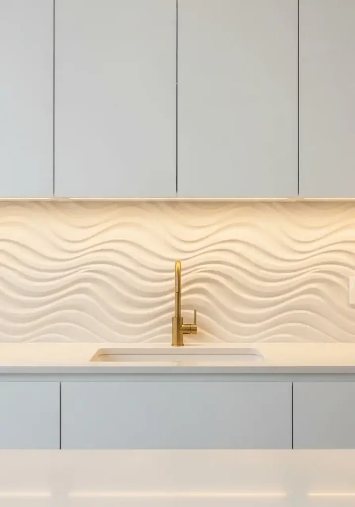 The undulating backsplash trend is the most dramatically three-dimensional and the most genuinely sculptural of all current kitchen tile directions — because it replaces the flat, two-dimensional surface of conventional tile installations with ceramic tiles specifically designed with curved, wave-like, or deeply textured surface profiles that create genuine physical relief across the backsplash wall, making the kitchen’s most prominent and most visible wall surface into a genuinely, physically three-dimensional composition that creates extraordinary, continuously changing light and shadow patterns throughout the day as the angle of light across the curved tile surfaces changes. The undulating backsplash is not a tile with a pattern — it is a tile with a form.