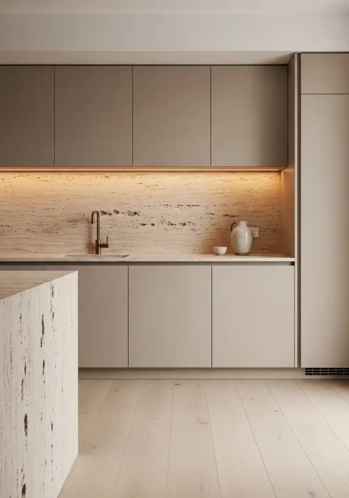 Travertine is the material that most completely and most authentically embodies warm minimalism’s specific material values — because travertine’s warm cream and honey tones with its characteristic natural voids and its gently varied surface quality create a countertop and floor material of such genuine organic warmth and such genuinely geological natural beauty that it transforms the kitchen’s material environment from cold precision to warm resolution with a completeness that no manufactured material of equivalent visual simplicity can approach. The warm minimalist kitchen with travertine countertops, ash floors, and putty greige cabinets is the kitchen aesthetic that most completely defines the current design moment.