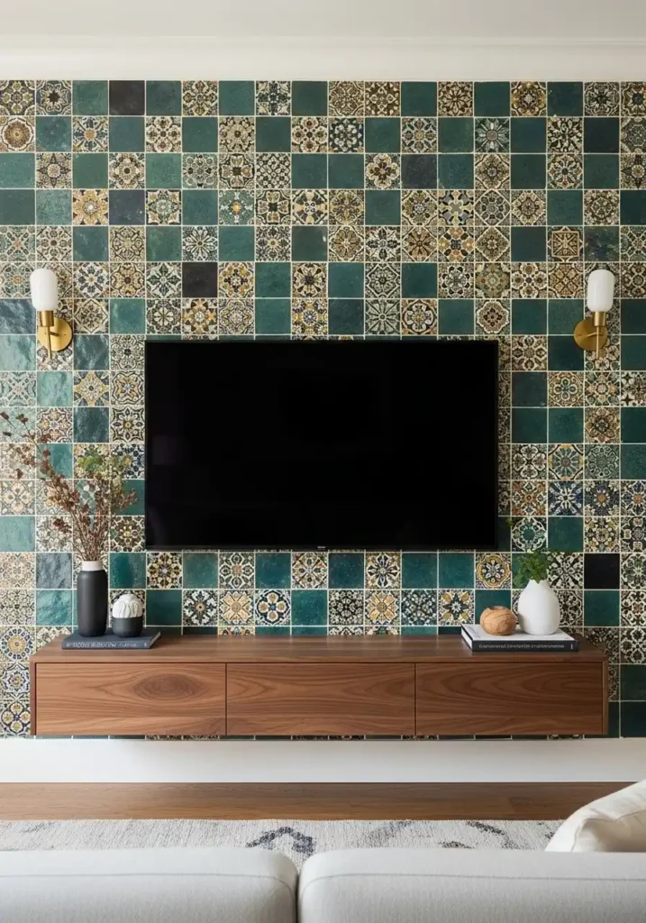 19. The Accent Tile TV Wall: Pattern and Color at Maximum Impact