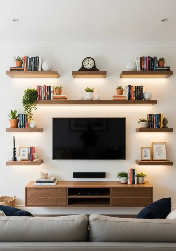 7. The Floating Shelves TV Wall: Stylish Storage on Beautiful Display