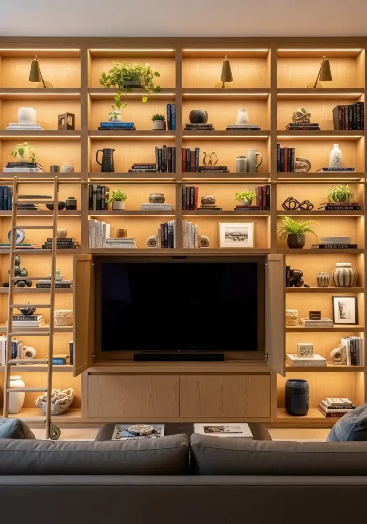 The integration of the television within a floor-to-ceiling bookshelf requires careful planning of the specific cabinet opening dimensions — the TV opening should be precisely sized to the television with minimal visible gap around the frame, creating the impression that the screen was always intended as part of the bookshelf design rather than retrofitted into it as an afterthought! Integrate LED lighting on each shelf level above and below the TV opening to illuminate the displayed objects beautifully and create a warm, glowing quality of illumination throughout the bookshelf composition. A rolling brass library ladder adds the most dramatically beautiful and genuinely useful finishing detail of the entire installation.