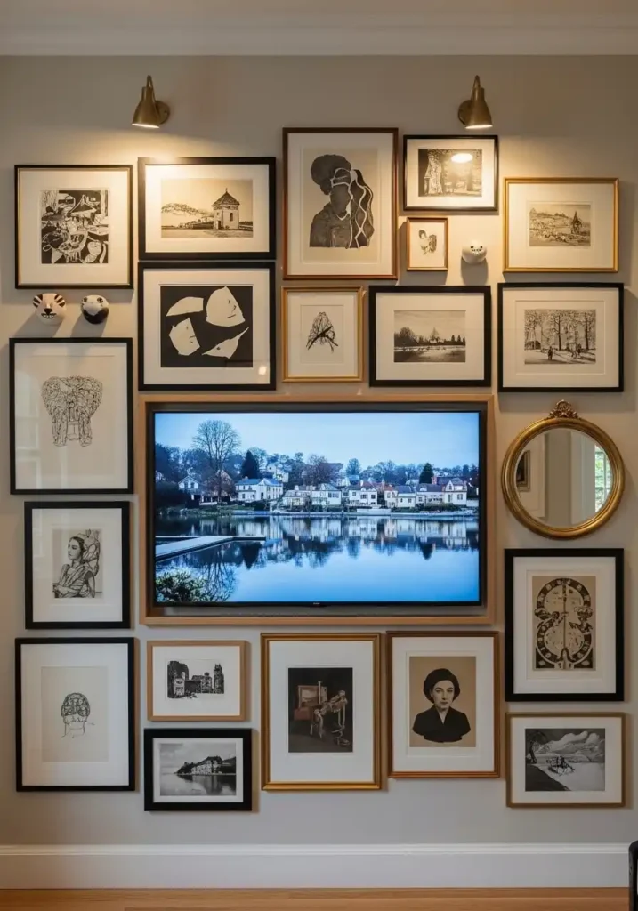 A gallery wall TV wall is the most creatively clever and most personally expressive solution to the universal challenge of making a television feel like an intentional, beautiful part of the living room rather than an unavoidable visual imposition that dominates every other design element competing for attention on the room’s most prominent surface! By treating the television as simply one element within a larger, carefully composed gallery arrangement of framed artwork, mirrors, and objects, you recontextualize the screen within a composition of genuine beauty and personal meaning that makes the whole wall — television included — feel deliberately designed and genuinely lovely.
