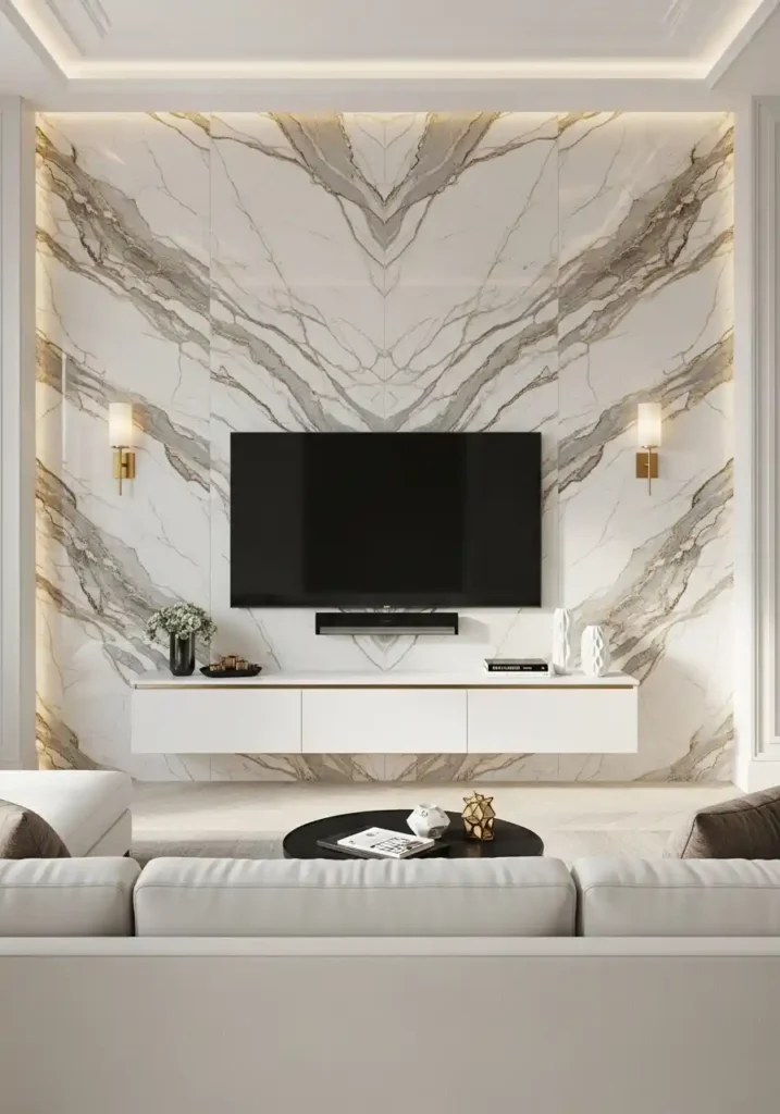 The book-matched installation — where two consecutive marble slabs or large format tiles are positioned to create a mirror-image veining pattern across the full TV wall — creates a visual symmetry of such extraordinary natural beauty and geological grandeur that the television mounted at its center appears to float within a frame of geological artwork rather than simply sitting on a wall! Large format porcelain tiles in 120x240cm or larger formats minimize grout lines and create the most seamlessly beautiful marble effect at a fraction of genuine stone installation cost. Flush-mount your television with a recessed bracket to maintain the marble wall’s visual continuity. A floating white lacquer or warm walnut media console completes the luxurious composition beautifully.