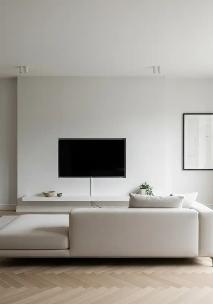 A minimalist TV wall designed with complete and confident restraint — nothing on the wall except the precisely positioned television itself, cables entirely concealed within the wall structure, and perhaps a single slim shelf below with one perfectly chosen object — creates a living room of extraordinary sophistication and genuine visual calm that communicates the most advanced and most intellectually demanding level of design thinking available: the understanding that what you remove from a composition is always more powerful than what you add to it!