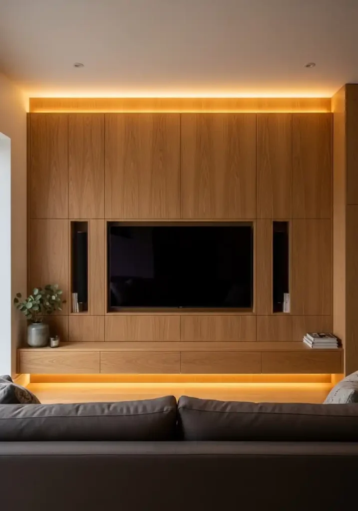 The integration of built-in storage cabinets within the wood-paneled TV wall framework creates the most complete and most beautifully unified media wall composition available — flanking cabinet sections that match the paneling material and finish create a seamless, furniture-quality installation of extraordinary beauty and practical excellence! Closed cabinet doors conceal media equipment, gaming consoles, and cable clutter behind the clean paneling surface, maintaining the architectural purity of the wall at all times. Warm LED strip lighting at the top of the wall panel creates a beautiful ambient glow that emphasizes the paneling’s vertical lines and gives the whole TV wall a warm, cinematically lit quality of genuine sophistication.