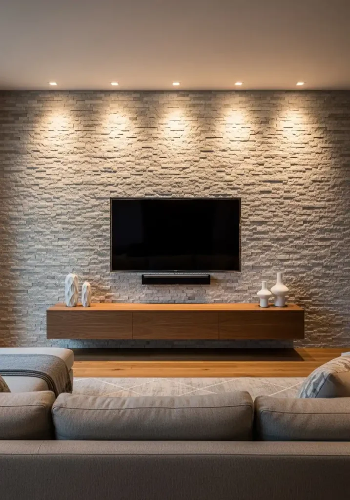 3. The Stone Veneer TV Wall: Dramatic Texture Behind the Screen