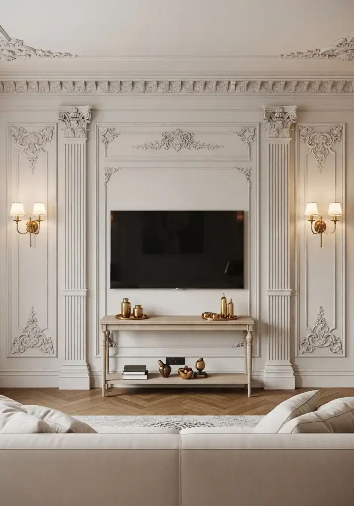18. The TV Wall With Decorative Moulding: Ornate Detail for a Luxurious Look