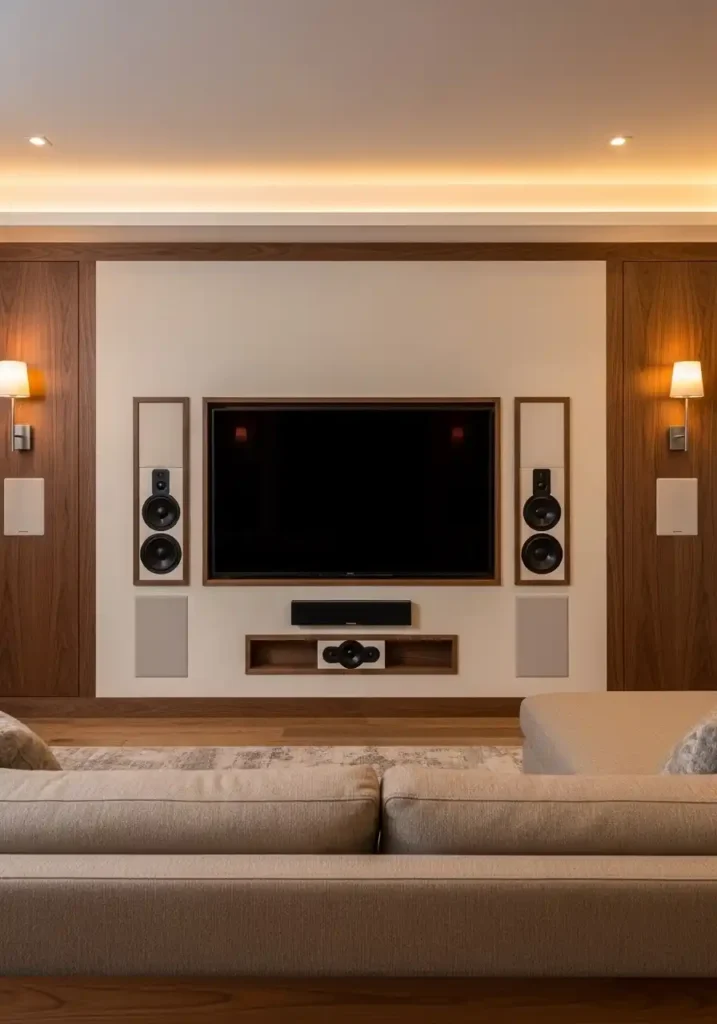 The visual integration of speakers within the TV wall design requires planning from the very earliest stages of the project — speaker positions must be determined before wall construction begins, cable routing must be planned through the wall cavity, and the surrounding wall material must be selected and detailed in coordination with the speaker manufacturer’s grille panel specifications to ensure the finished installation achieves the seamless, fully integrated appearance that makes this approach so impressively beautiful! In-wall speakers finished with grille panels painted to match the surrounding wall surface become essentially invisible acoustic apertures within the wall composition. Flush soundbar alcoves below the television maintain the wall’s visual continuity. The result is a living room of extraordinary audio-visual sophistication.