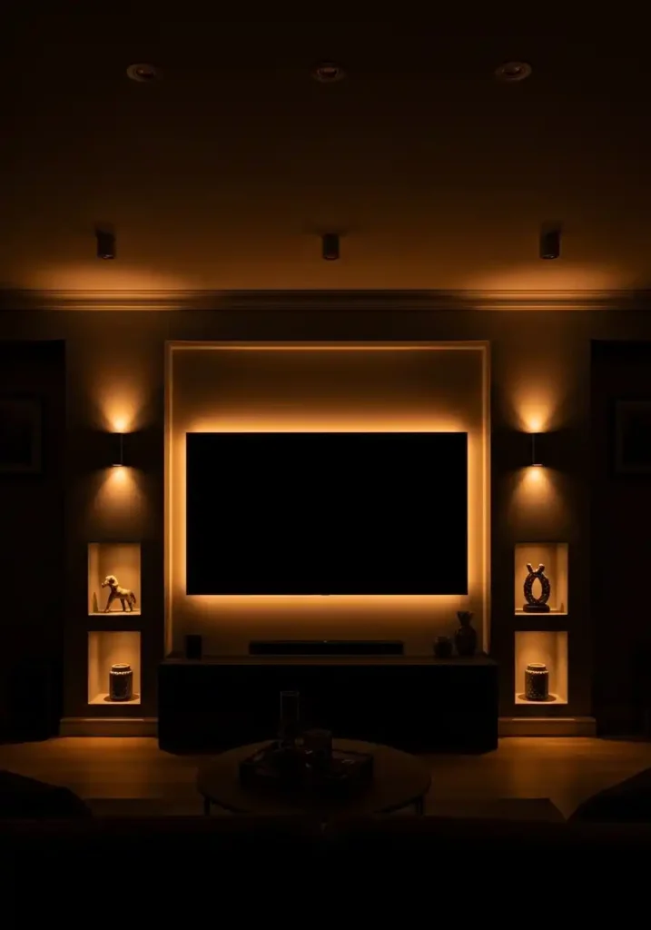 The complete mood lighting TV wall system begins with the television’s bias backlight creating a warm ambient glow behind the screen — reducing eye strain and creating the most immersive viewing atmosphere! Integrated shelf lighting within built-in alcoves illuminates displayed objects with warm directional light that creates beautiful depth and visual richness in the wall composition. Wall sconces flanking the television at viewing height provide warm face-level light for socializing before and after viewing. Recessed ceiling spotlights on individual circuits provide flexible overhead fill light. All zones on separate dimmers create infinite atmospheric combinations. This comprehensive lighting design transforms the living room TV wall from a viewing surface into a complete, curated, and genuinely extraordinary daily living experience of real and lasting beauty.