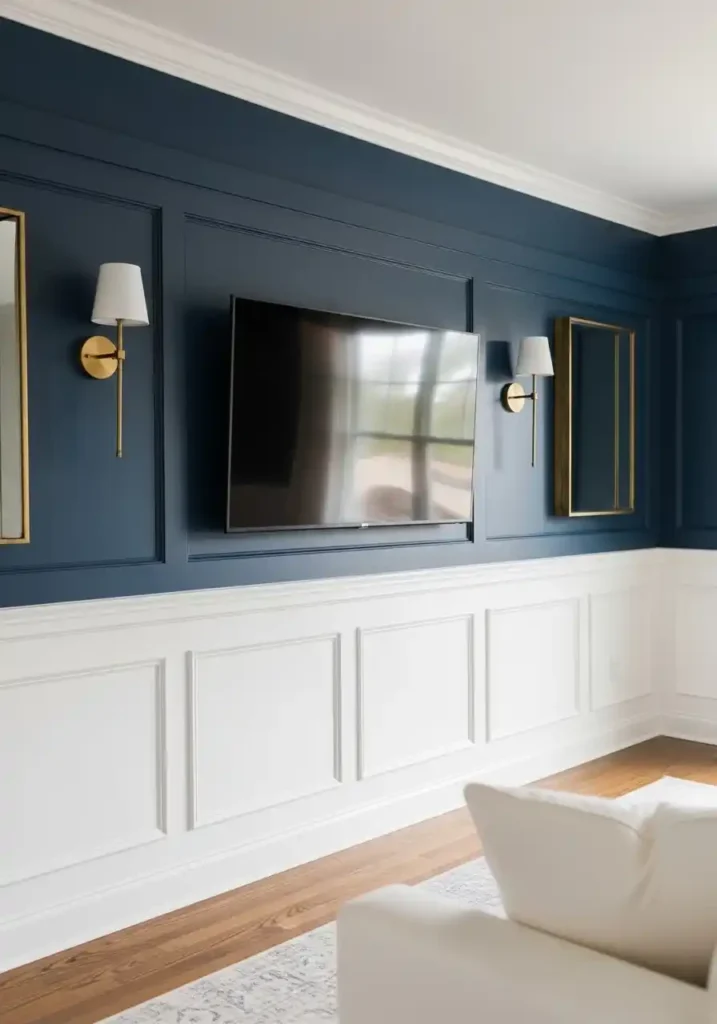 The most beautiful wainscoting TV wall designs use the cap rail line as a deliberate color and material transition — white or cream paneling below creating brightness and craft detail, with a bolder, richer color above providing the most striking possible backdrop for the mounted television! Deep navy above white wainscoting creates a classic, deeply sophisticated result. Forest green above white paneling creates a beautifully botanical and architecturally rich backdrop. Deep charcoal above warm cream paneling creates contemporary moodiness with traditional craft detail. The television mounted in the colored upper zone against the rich backdrop appears more integrated and more intentional than it would against either a uniformly light or uniformly dark wall — the wainscoting’s architectural context gives the screen genuine compositional purpose.