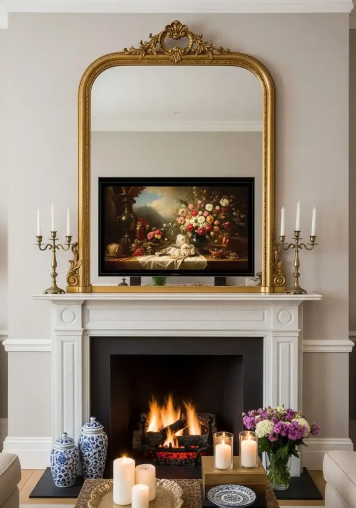 The Samsung Frame TV is the most accessible and most beautifully functional hidden television solution available — a flat screen television with a matte anti-reflective display surface and optional decorative bezels in a range of wood and metal finishes that, when displaying its curated art mode content from the accompanying subscription service, is genuinely and completely indistinguishable from a real framed artwork to the vast majority of visitors at normal viewing distances! Style it within an ornate gilt frame that matches the television’s outer dimensions for the most convincing artwork illusion. Mount above a classically styled fireplace mantel for the most beautiful traditional living room focal wall. Display art that genuinely suits your room’s color palette and aesthetic direction for complete visual integration.