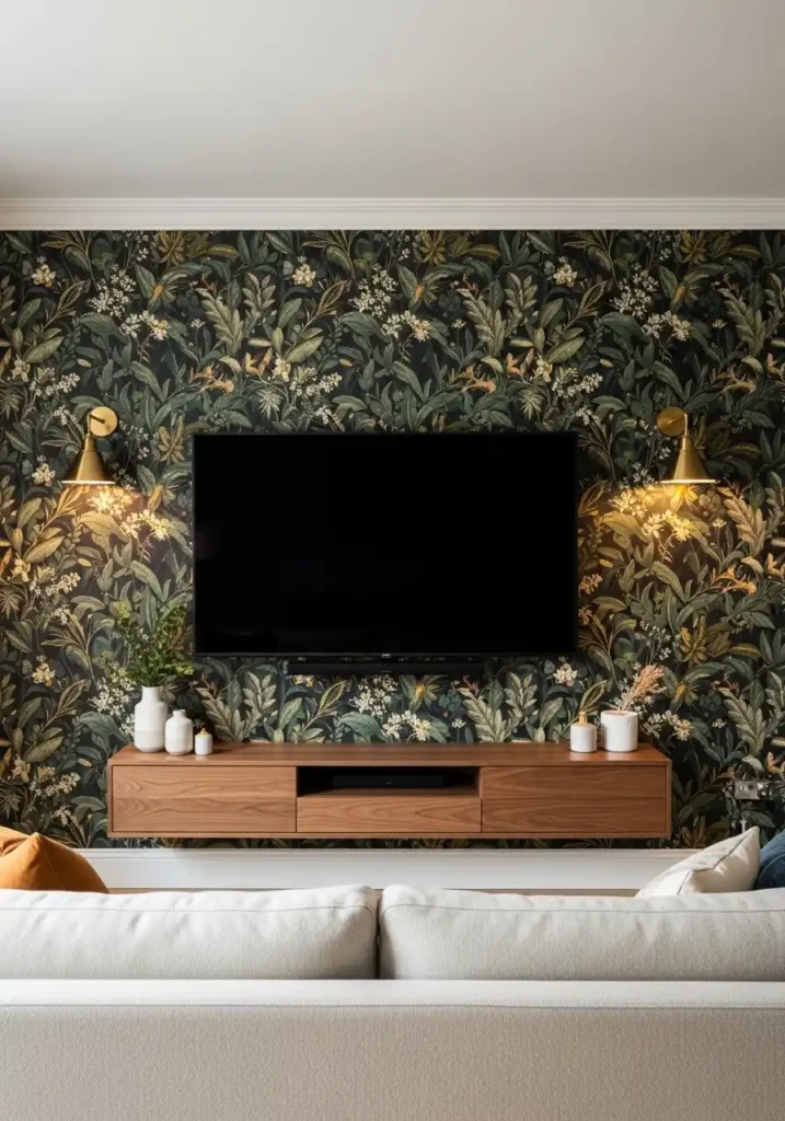 10. The Wallpaper TV Wall: Pattern and Drama Behind Your Screen