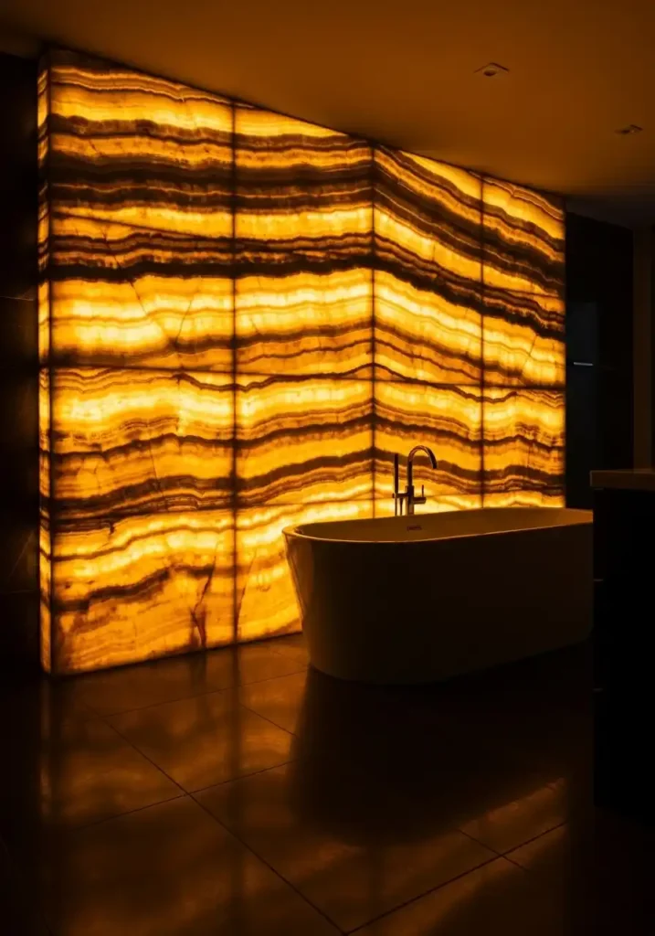 Onyx is one of the most extraordinary natural materials available to interior designers precisely because of a quality unique among stones — its translucency. When backlit with warm LED lighting, an onyx panel becomes a luminous, glowing surface of extraordinary beauty, its veining patterns illuminated from within like stained glass or a geological lantern. The effect is unlike anything else achievable in interior design: warm, amber, jewel-toned light emanating from the walls themselves, transforming the bathroom into an environment of almost magical atmospheric warmth.