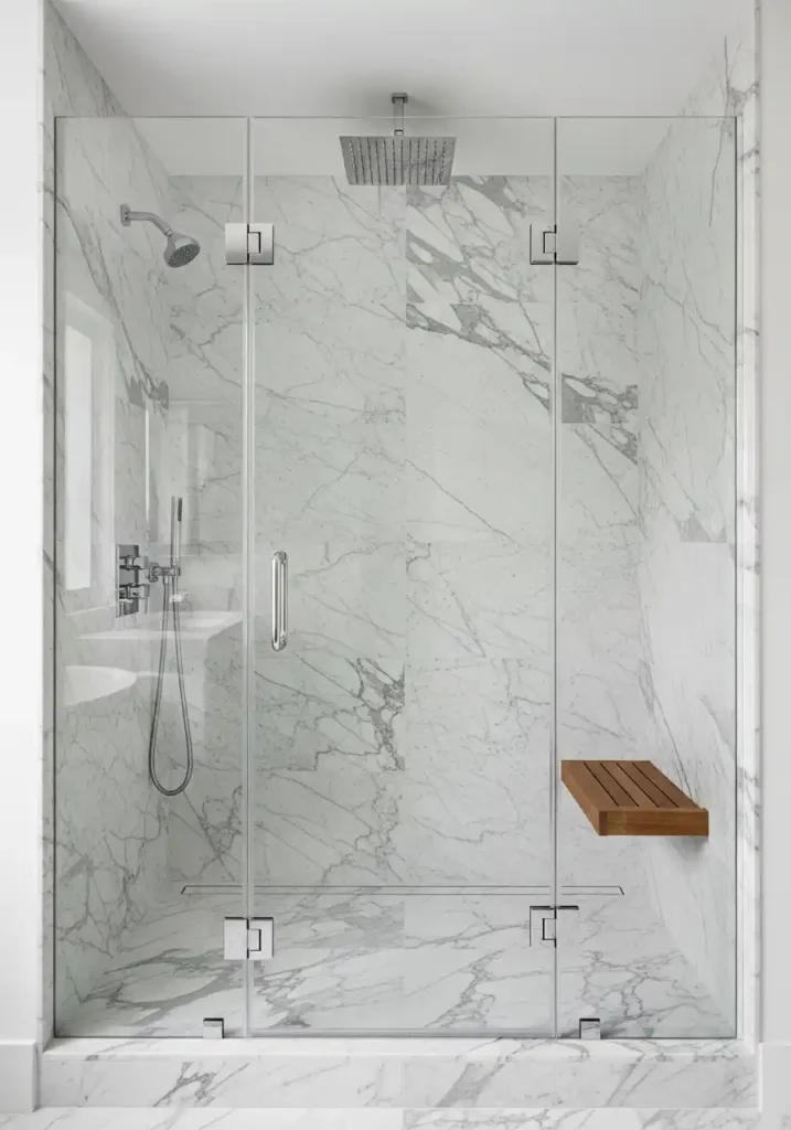 The visual continuity created by a frameless glass enclosure — where the same tile or stone flows from the bathroom floor into the shower floor and up the shower walls without any threshold or frame breaking the connection — is one of the defining characteristics of the finest luxury bathroom design. The shower reads not as a separate, enclosed zone but as a beautiful wet room embedded within the larger bathroom composition. The effect is particularly stunning when the floor tile is laid continuously across both spaces, further dissolving the boundary between shower and room in a way that feels both visually radical and completely natural.
