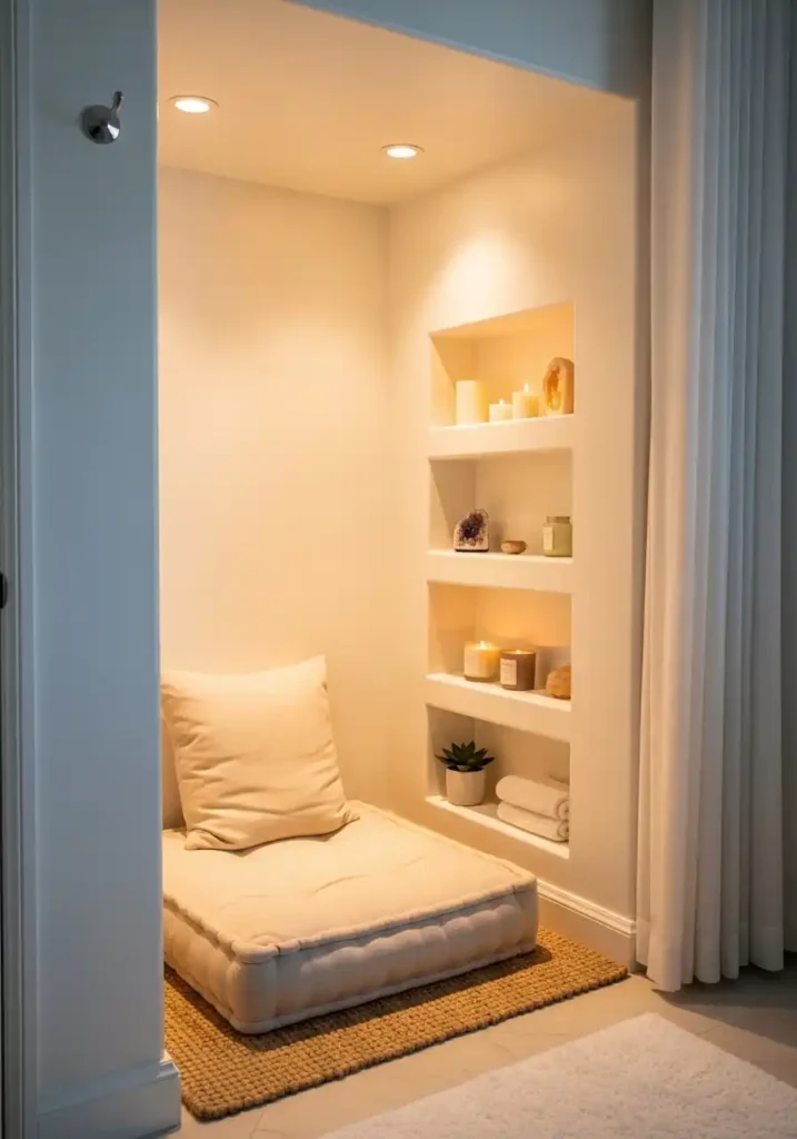 This nook requires very little space — an alcove two feet deep and three feet wide is sufficient — but it requires genuine design intention to execute well. Built-in shelving at a comfortable reach height for candles, a small book, and a few meaningful objects creates a personal altar quality that makes the space feel sacred without being prescriptive. Soft, dimmable lighting at a lower level than the rest of the bathroom creates a distinct atmosphere that signals to your nervous system that this is a different kind of space with a different kind of purpose. It is one of the most quietly radical and deeply appealing ideas gaining momentum on Pinterest’s wellness and self-care design boards.